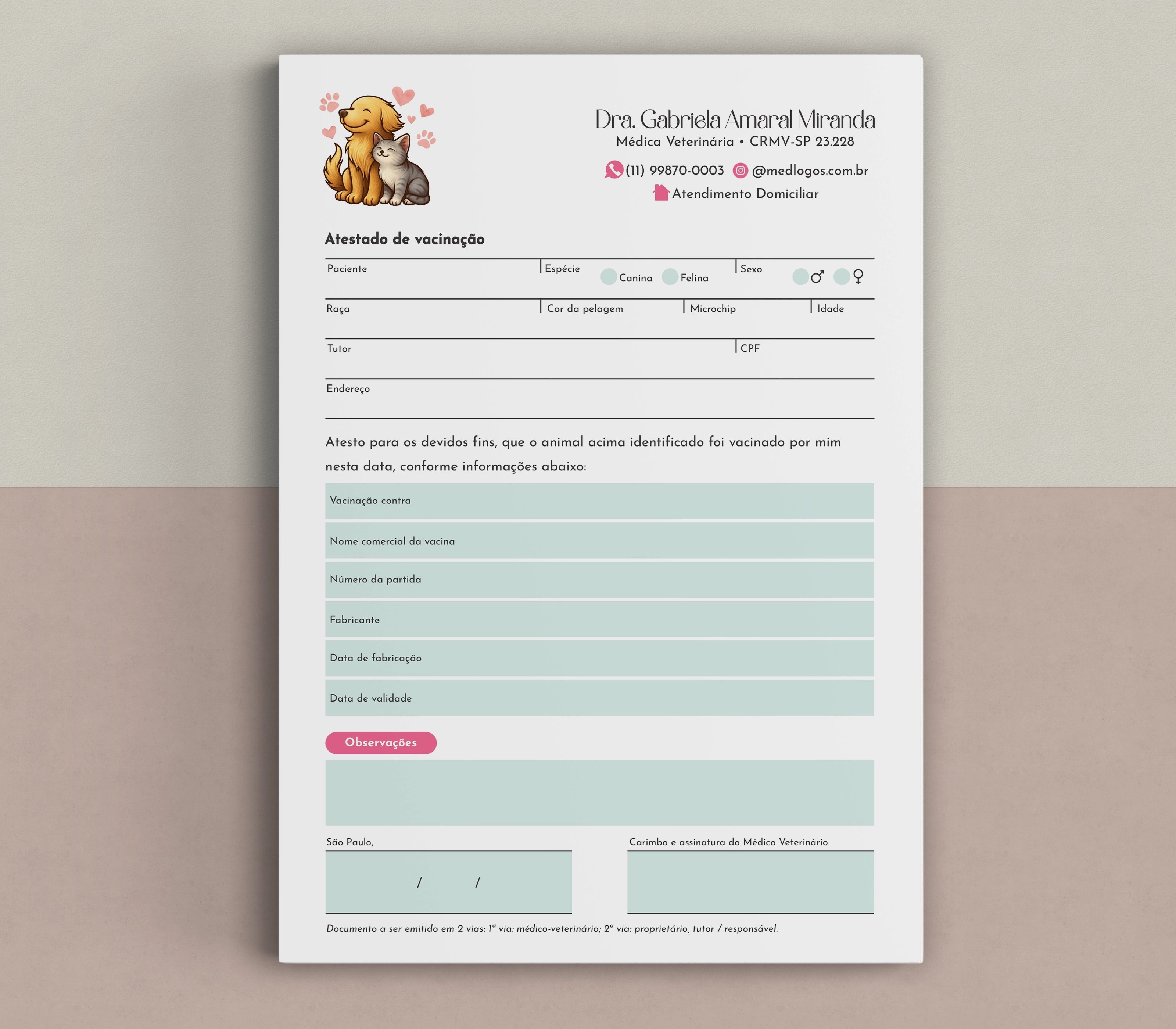 O Atestado de Vacinação Veterinário é impresso em Paperfect® 90g/m², papel offset técnico com excelente lisura, opacidade e nitidez — ideal para registros formais com escrita clara e apresentação profissional.