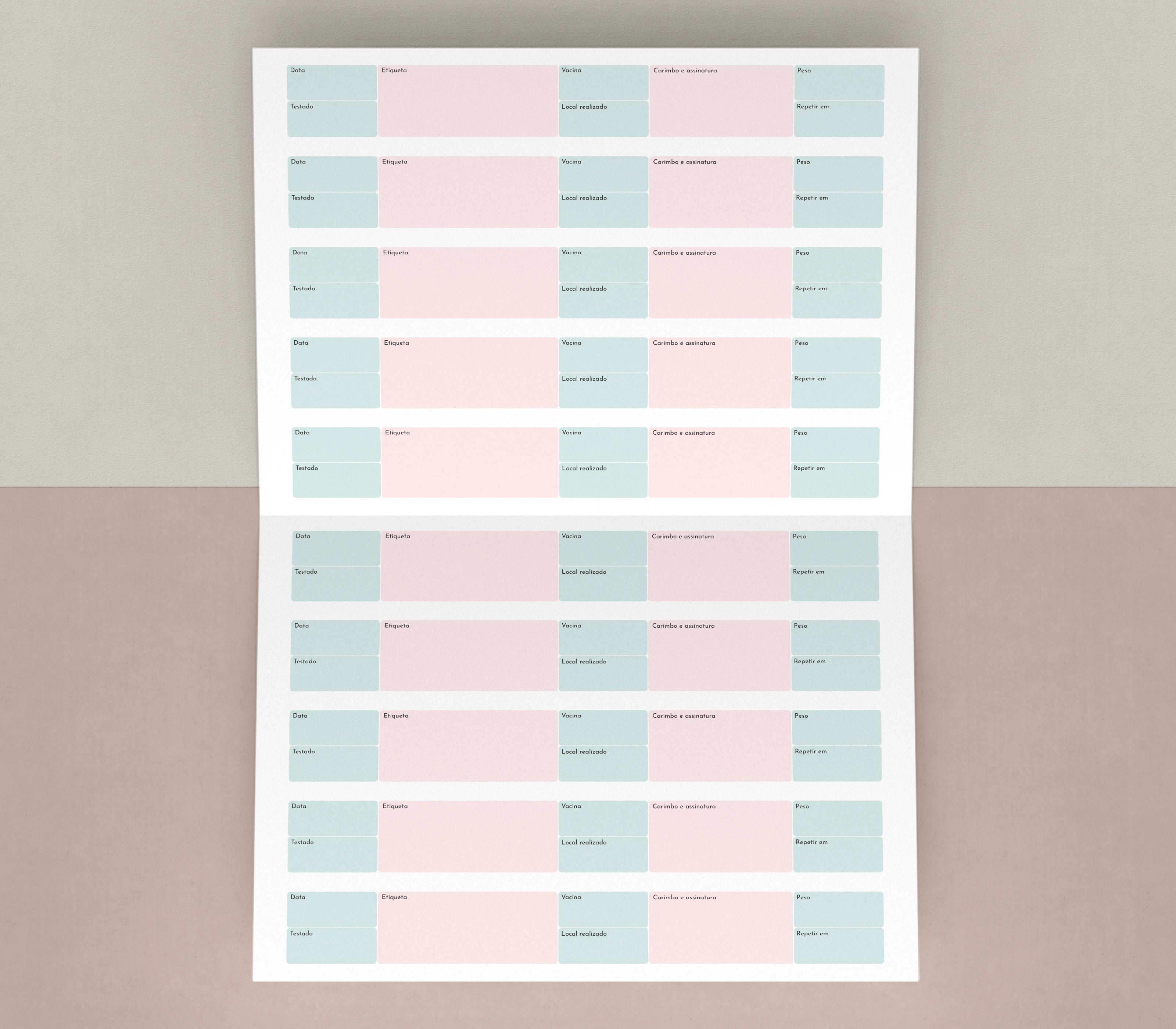 Com dois vincos paralelos e layout expansivo, o formato 30 x 20 cm (aberto) acomoda mais dados, maior clareza e capacidade para até 10 vacinas, mantendo o visual limpo e organizado, com campos para indicar se o animal foi testado e também o local de aplicação da imunização.