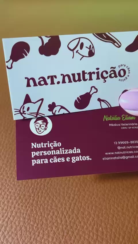 O cartão de visita premium é impresso em Couché Press® 300g/m², com acabamento em laminação fosca e verniz localizado, que confere brilho seletivo e leve relevo ao toque nas áreas destacadas do design.